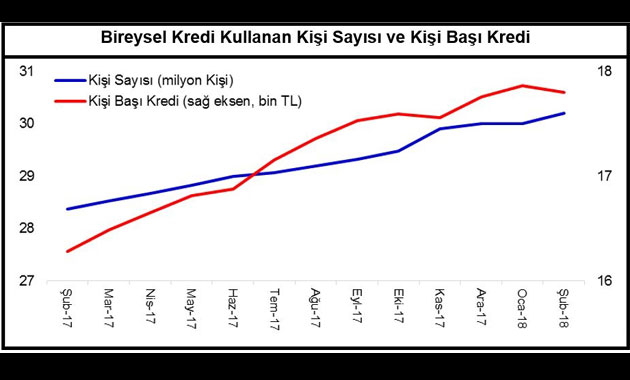 Bireysel nitelikli ürünü olan kişi sayısı (takipteki krediler dışında) son bir yılda 1.8 milyon artarak 30.2 milyon kişi olurken, ortalama kredi bakiyesi ise 18 bin lira düzeyinde gerçekleşti.