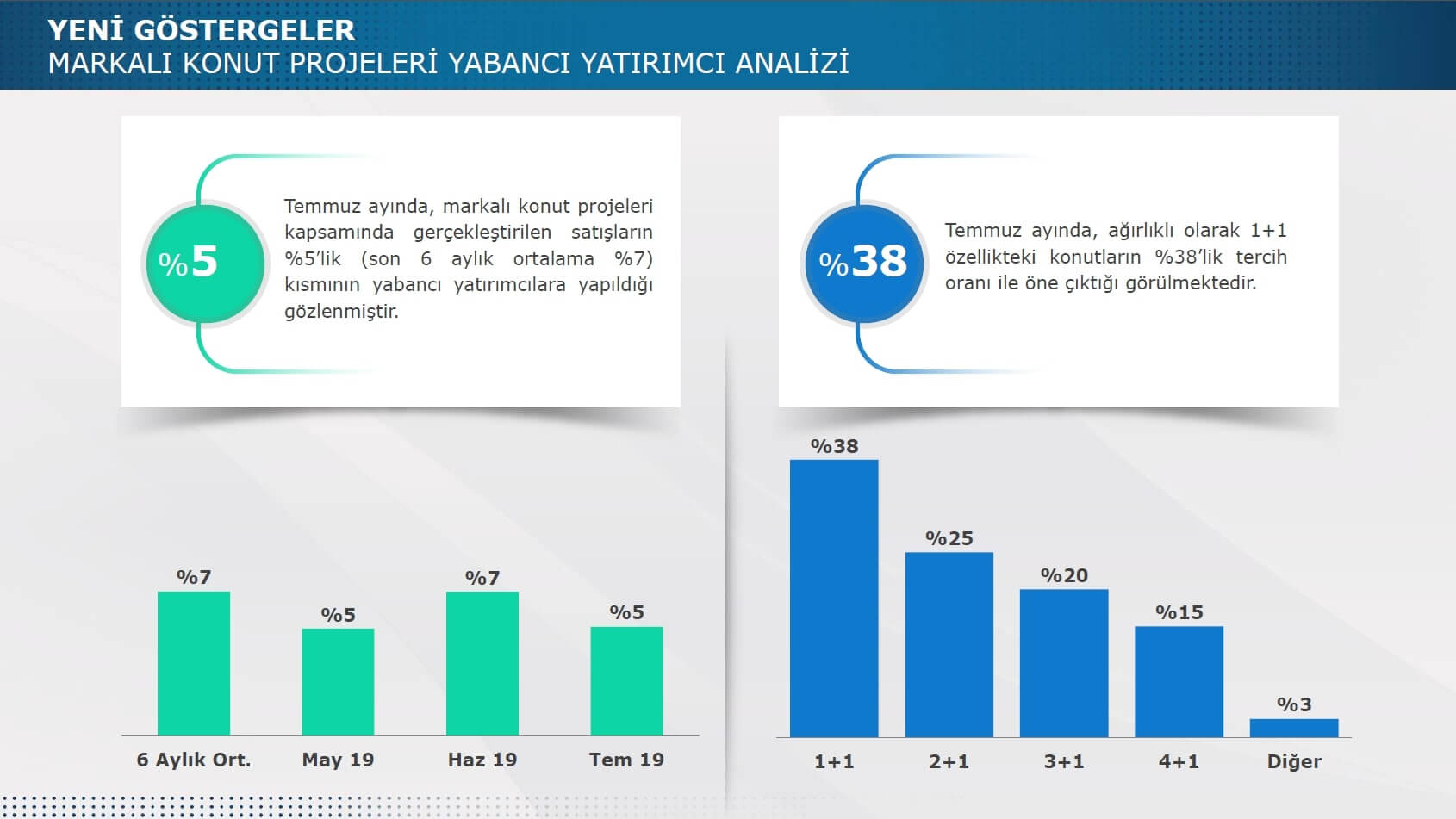 Temmuz ayında, markalı konut projeleri kapsamında gerçekleştirilen satışların %5’lik (son 6 aylık ortalama %7) kısmı yabancı yatırımcılara yapılırken, bu satışlarda ağırlıklı olarak 1+1 özellikteki konutların tercih edildiği gözlenmiştir.