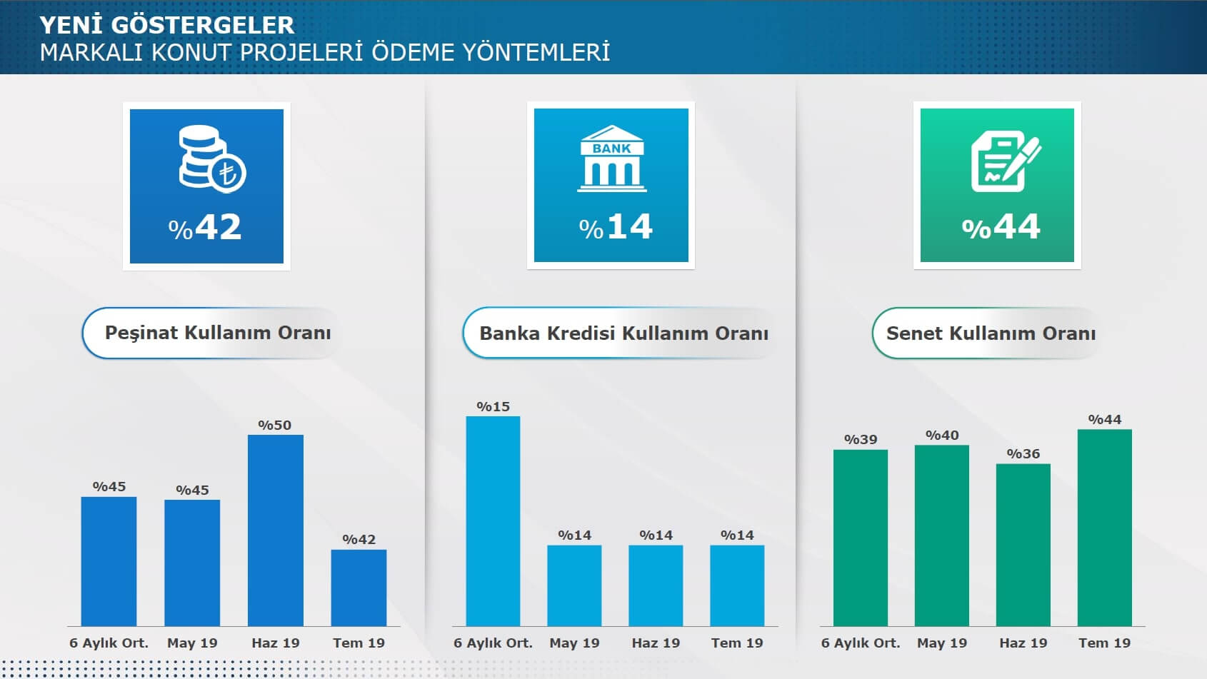Kredi oranlarının çok yüksek olması markalı projelerdeki satış yöntemine de yansımış olup banka kredisi ile yapılan satışların oranı %14’dür. Geçen yılın Temmuz ayında bu oran % 17 olarak gerçekleşmiş ve neredeyse geçen yıl ile aynı olmaktadır. Senet kullanımı ise geçen yıla göre neredeyse eşit olmaktadır.