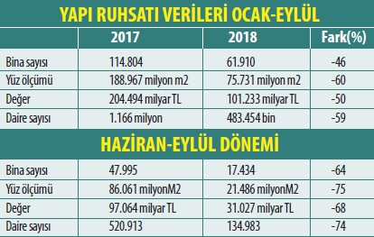 İnşaata başlamak için belediyeler tarafından verilen yapı ruhsatı başvuru sayısı ilk 9 ayda yüzde 41 azaldı. İkamet edilen binalarda ise Haziran-Eylül 2018 döneminde daire sayısı geçen yıla göre, 520 bin adetten 135 bine düştü. Artan maliyetler karşında zor durumda olan sektörün metrekare alanı da aynı dönemde yüzde 75 daraldı.