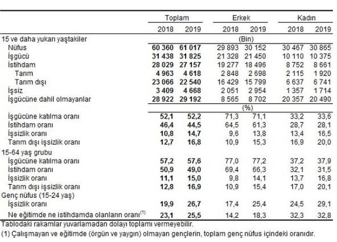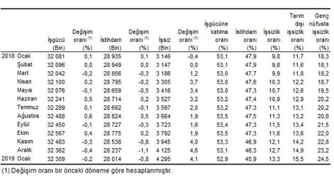 Türkiye İstatistik Kurumu (TÜİK) tarafından açıklanan 2019 yılı Mart ayı İşsizlik Rakamları çerçevesinde Türkiye genelinde 15 ve daha yukarı yaştakilerde işsiz sayısı 2019 yılı mart döneminde geçen yılın aynı dönemine göre 1 milyon 334 bin kişi artarak 4 milyon 544 bin kişi oldu. İşsizlik oranı 4 puanlık artış ile yüzde 14,1 seviyesinde gerçekleşti.