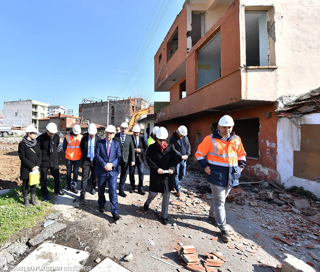 İzmir Büyükşehir Belediye Başkanı Aziz Kocaoğlu, ilk yıkımların başladığı Örnekköy kentsel dönüşüm proje alanını ziyaret etti. Belediye’nin mülkiyetinde bulunan imar adasında yapılacak 1. etap için 18 bağımız yapının yıkımının gerçekleştiği alanı gezerek bürokratlarından bilgi alan Başkan Kocaoğlu, bölgede oturan vatandaşlarla da sohbet etti.