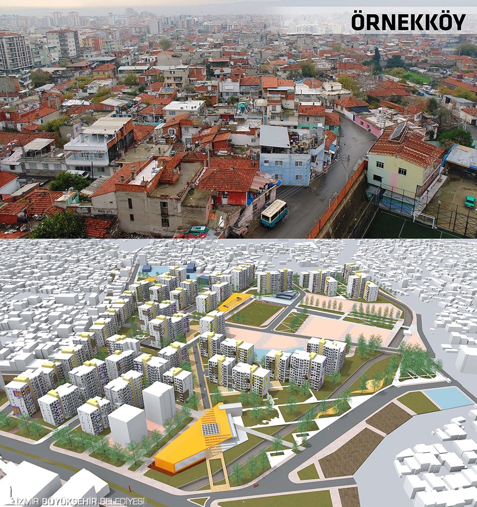 İzmir Büyükşehir Belediyesi, yerinde dönüşüm ve uzlaşı esası ile sürdürdüğü Örnekköy Kentsel Dönüşüm Projesi’ndeki yeni konutları etaplar halinde inşa edecek. Toplam 3520 konut ve 338 adet işyerinin yer aldığı 18 hektarlık proje alanında 60 m² (1+1) ,70 m² (2+1), 83 m² (2+1), 96 m² (2+1), 108 m² (3+1) ve 123 m² (3+1) olmak üzere toplam 6 ayrı konut tipi tasarlandı.