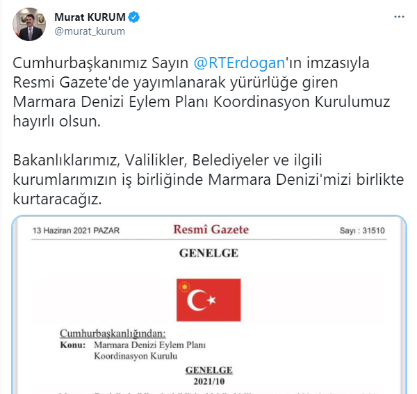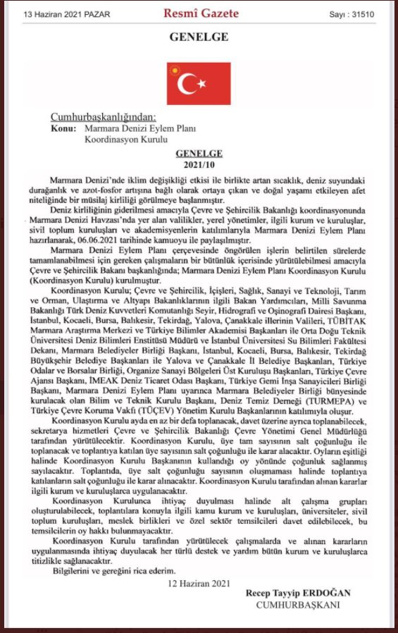 Resmi Gazete’de, Cumhurbaşkanı Erdoğan’ın imzasıyla yayımlanan genelgede, “Marmara Denizi’nde iklim değişikliği etkisi ile birlikte artan sıcaklık, deniz suyundaki durağan ve azot-fosfor artışına bağlı olarak ortaya çıkan ve doğal yaşamı etkileyen afet niteliğinde bir müsilaj kirliliği görülmeye başlanmıştır” denildi.