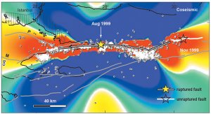 “Fay hatları sıkıştığı zaman şiddetli depremler meydana gelir. Tektonik gerilim birikir ve sismik enerji bir depremle serbest kalır. Bu en son 1999 yılında İzmit yakınında,İstanbul’un 90 km doğusunda bulunan Kuzey Anadolu fayının bir bölümünde gerçekleşmişti.