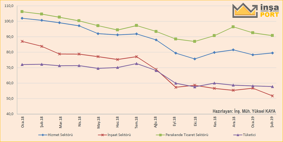 Mevsim etkilerinden arındırılmış inşaat sektörü güven endeksi bir önceki ayda 56,7 iken, Şubat ayında yüzde 8,7 oranında azalarak 51,8 oldu. İnşaat sektöründe bir önceki aya göre; alınan kayıtlı siparişlerin mevcut düzeyi ve toplam çalışan sayısı beklentisi endeksleri sırasıyla yüzde 12,1 ve yüzde 6,4 azalarak 40,8 ve 62,8 değerlerini aldı.