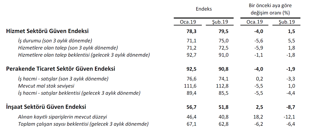 Türkiye İstatistik Kurumu (TÜİK), güven endekslerini her ay düzenli olarak yayımlamaktadır. Hizmet sektörü dışındaki diğer güven endekslerinin hepsinde azalma olmuştur.