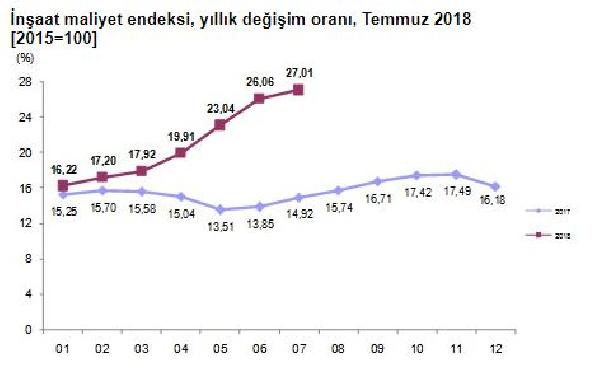 Rapora göre Temmuz’da inşaat maliyet endeksi aylık yüzde 1.63, yıllık yüzde 27.01 arttı.