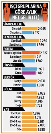 İşçilerde sigortasızlık oranı ise dikkat çekici. İşçilerin ortalama yüzde 82’si işyerinde sigortalı çalışıyor, yüzde 18’inin de sigortası yok. Ancak, sigortasızlık cinsiyete, eğitime ve kayıt dışılığa göre değişiyor. Sigortasızlık kadınlarda yüzde 21, 15-19 yaş arasında yüzde 43, 20-24 yaş arasında ise yüzde 34.