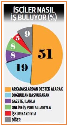 ARAŞTIRMAYA göre, işçilerin yüzde 51’i tanıdıkları veya arkadaşlarının desteğiyle işine yerleşmiş. İŞKUR’un buradaki oranı yüzde 5. İşsiz kalma süresi ise ortalama 1 ay. İşçilerin yüzde 15’i hemen iş bulduğunu belirtirken, 1 haftadan uzun işsiz kalanların oranı yüzde 14, bir ay ve daha uzun süre işsiz kalanların oranı ise yüzde 71. 1-4 hafta işsiz kalma oranı ise yüzde 23 ile öne çıkıyor. 1 yıldan uzun süredir işsiz olanların oranı ise yüzde 9 ile dikkat çekiyor.