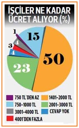 Rapora göre, işçilerin ortalama hane büyüklüğü 3.5 kişi ve ailede 2.5 kişi çalışıyor. Giydirilmiş net gelir yani maaş, ikramiye, prim, sosyal ödemeler gibi her şey dahil ortalama ücretleri ise 1894 lira. İşçilerin yüzde 16’sı ise asgari ücretin altında net gelire sahip. Kadın erkek işçi farkı araştırmada da ortada, erkeklerde ücret ortalaması 1973 lira iken kadınlarda ortalama ücret 1812 lira. İşçilere göre çalışma hayatının en önemli sorunu düşük ücretler ve işsizlik. Düşük ücret yanıtı verenlerin oranı yüzde 77, işsizlik diyenler ise yüzde 75. Sigortasız çalıştırmayı da sorun olarak gören işçilerin oranı ise yüzde 47.