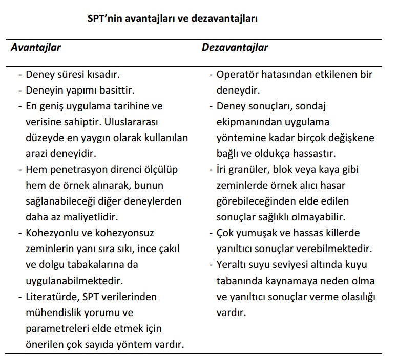 Bu yazımızda, Zemin Mekaniği ve Geoteknik Mühendisliğinde oldukça önemli olan SPT deneyinden bahsedeceğiz. Zemin Mekaniği literatüründe SPT sonuçları ile kohezyonsuz zeminlerin göreceli sıkılığı, kohezyonlu zeminlerin kıvam durumu, zeminlerin kayma dayanımı ve sıkışabilirlik parametreleri, sıvılaşma potansiyeli arasında çok sayıda korelasyon mevcuttur. SPT, birçok zeminde uygulanabilse de özellikle iri granüler danelerin olmadığı kumlu zeminlerde gerçekçi ve tutarlı sonuçlar vermektedir