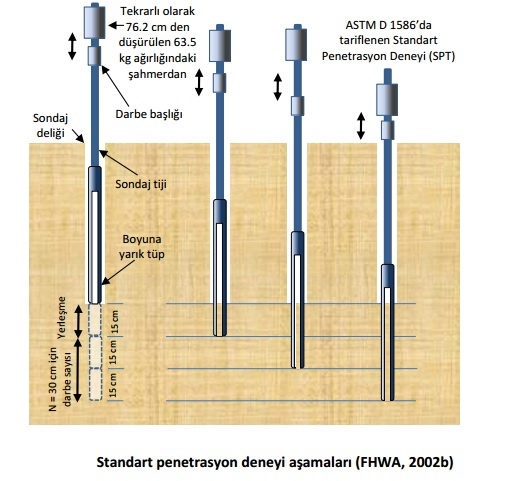 İlk 15 cm’lik penetrasyon yerleşme aşaması olarak tanımlanmakta ve bu penetrasyon için gerekli darbe sayısı delgi tabanında oluşabilecek örselenmeler nedeniyle dikkate alınmamaktadır. İkinci ve üçüncü 15 cm’lik penetrasyon için gerekli darbe sayıları toplanarak; bu değer Standart Penetrasyon Sayısı, 𝑁, değeri olarak kaydedilir. Deney sondaj içerisinde genellikle 1.5 m’de bir adet olmak üzere tekrarlanır. Deneyin, maksimum dane boyunun örnek alıcının yarıçapından daha büyük olan zeminler için uygulanması tavsiye edilmemektedir. Standart penetrasyon deney aşamaları aşağıdaki şekilde verilmiştir.