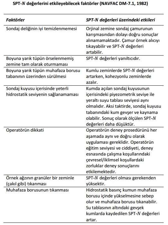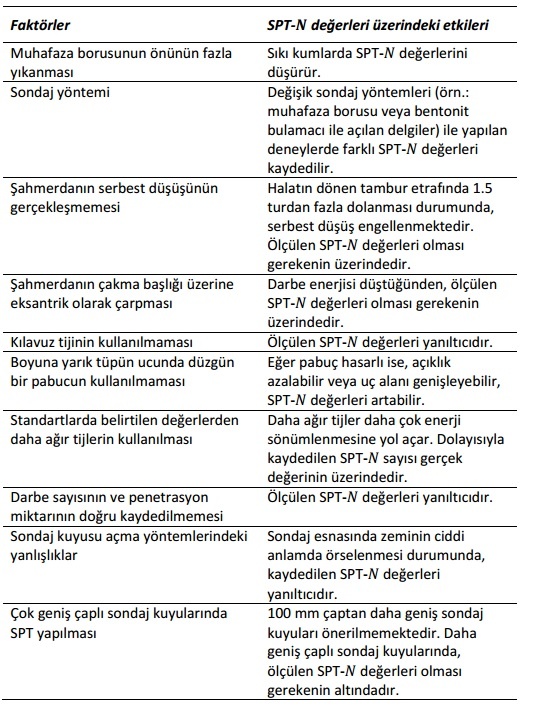 Deney yapımı esnasında genel olarak operatörden veya standartlara uyulmamasından kaynaklanan hatalar oluşmaktadır. Bu hatalar deney sonuçlarını önemli ölçüde etkileyebilmektedir. NAVFAC DM 7.1 (1982)’de, deney öncesinde ve esnasında yapılan olası hatalar ve bu hataların SPT-N değeri üzerindeki etkileri aşağıdaki tabloda özetlenmiştir.