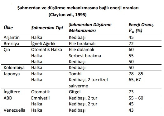 Ülkemizde son zamanlarda emniyetli tip şahmerdanlar kullanılmaya başlanmış olsa da, halen yaygın olarak halka tipi şahmerdan, kedibaşı ve iki tur dolama sistemi kullanılmaktadır. Tablo 1.4’te görüldüğü gibi bu sistemde enerji oranı %45’tir. Aşağıdaki tablo incelendiğinde enerji oranlarının %43 ila %85 aralığında değiştiği, dolayısıyla enerji düzeltmesi yapılmadığı durumda SPT-𝑁 değerlerinde iki kat mertebesinde farklılıklar ortaya çıkabildiği anlaşılmaktadır.