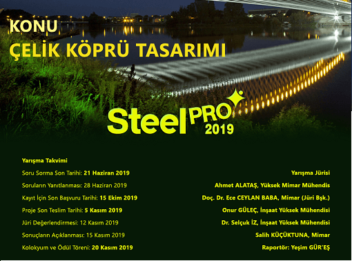 Çelik Yapı Tasarımı Öğrenci Yarışması (SteelPRO 2019), 2018-2019 döneminde Mimarlık ve İnşaat Mühendisliği bölümlerinde lisans öğrenimi gören öğrencilere açık bir yarışmadır. Yarışmaya katılacak projenin taşıyıcı sistemi çelik olması gerkemektedir.
