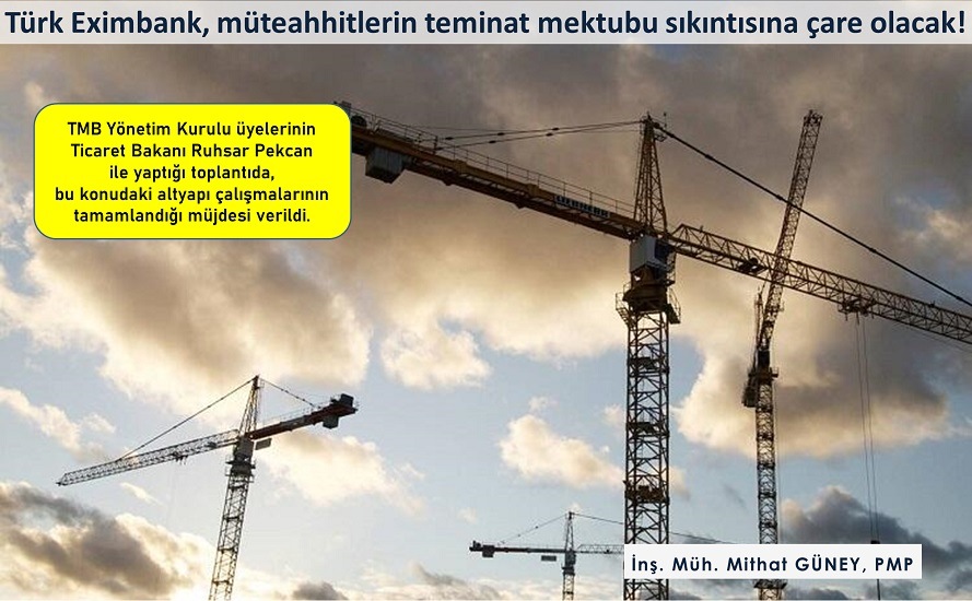 Türk Müteahhitlerin uzun süredir dile getirdiği “Türk Eximbank teminat mektubu versin” talebi karşılık buldu. TMB Yönetim Kurulu üyelerinin Ticaret Bakanı Ruhsar Pekcan ile yaptığı toplantıda, bu konudaki altyapı çalışmalarının tamamlandığı müjdesi verildi.
