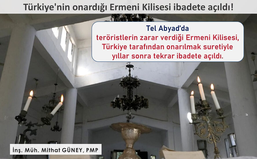 Barış Pınarı Harekatı ile Türk askerleri tarafından terör örgütü YPG/PKK’dan temizlen Tel Abyad’da hayat normale dönüyor. Halkın ihtiyaçlarının giderilmesi için hemen her alanda onarım ve yenileme çalışmaları sürüyor. Ermeni Kilisesi de teröristler tarafından mevzi haline getirilmiş ve zarar görmüştü.