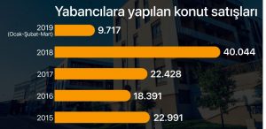 Yabancılara yapılan konut satışları bir önceki yılın aynı ayına göre yüzde 71,3 artarak 3 bin 129 oldu. Yabancılara yapılan konut satışlarında, Mart 2019’da ilk sırayı 1 bin 520 konut satışı ile İstanbul aldı. İstanbul ilini sırasıyla 626 konut satışı ile Antalya, 173 konut satışı ile Ankara, 121 konut satışı ile Bursa ve 110 konut satışı ile Yalova izledi.