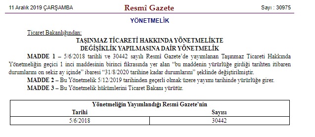 Resmi Gazete ile yayımlanan son düzenlemeye göre Taşınmaz Ticareti Hakkında Yönetmelik için verilen son tarih 31 Ağustos 2020 olarak duyurulmuştu. Yani 31 Ağustos 2020 tarihi itibari ile yeni bir erteleme kararı çıkmadığı takdirde taşınmaz ticareti yetki belgesi resmi olarak yürürlüğe girmiş olarak kabul edilecek.