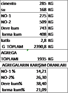 Beton santralinde üretilen C25 betona ait malzeme miktarları tablo 1’ de, Agrega gradasyonları ise tablo 2’de gösterilmiştir.