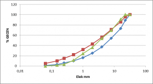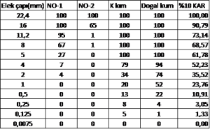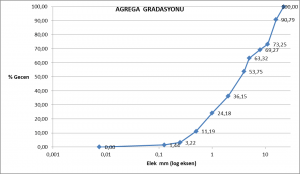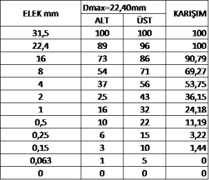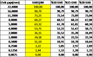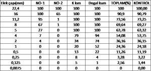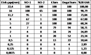 Bu çalışmanın esasını teşkil eden İnce agrega miktarının azaltılarak azaltılan miktar kadar kaba malzemenin artırtılması durumunda agrega gradasyon tabloları ve grafikleri aşağıda gösterilmiştir.