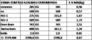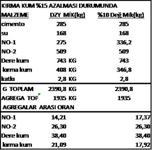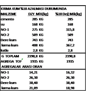 Tablo-3 kırma kum miktarı %10 azaltılması durumunda yeni malzeme miktarları ve oranları