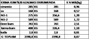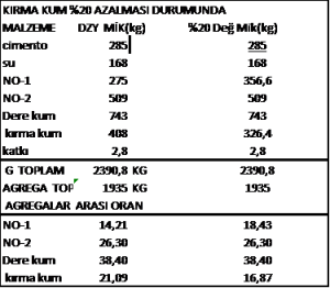 Tablo-7 Kırma kum miktarı %20 azaltılması durumunda yeni malzeme miktarları ve oranları