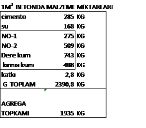 Tablo-1 C25 Dizaynında Malzeme Miktarları