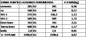 Tablo-5 Kırma kum miktarı %15 azaltılması durumunda yeni malzeme miktarları ve oranları