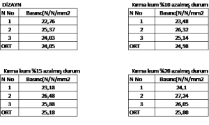 Kırma kum miktarları azaltılarak iri malzeme miktarı arttırılması durumuna göre hazırlanan küp numuneler yedi günde kırılarak basınç dayanımları tespit edilerek aşağıdaki tabloda gösterilmiştir;