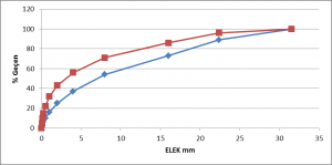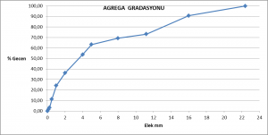 C25 betonda maksimum dane boyutu 22,4mm olup ts 802 göre elek analizi agrega gradasyonun grafik 5-6‘ da gösterilmiştir.