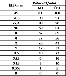 TS 500 ‘de maksimum dane boyutuna göre agrega karışım gradasyonu tablo 3,4 elek açıklığının mm ve logaritmik ölçekte olması durumunda grafik 2 ve 3 ‘de gösterilmiştir.