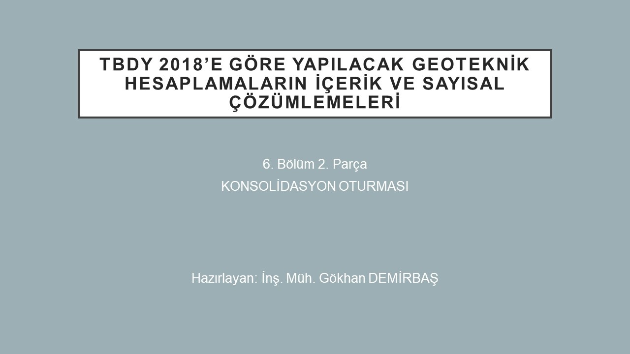 Altıncı bölümün ikinci parçasında Türkiye Bina Deprem Yönetmeliği’nin 16. Bölümü kapsamında “Konsolidasyon oturması” kavramını anlatarak bir sayısal örnek ile göstermek istiyorum.