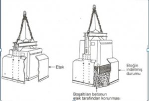 Bazı kovaların üstü de kapalıdır ancak boşaltma için ortada dar çaplı bir delik bırakılmıştır. Beton çuvalların içinde, altı açılabilen kapalı kovalarla taşınmaktadır.