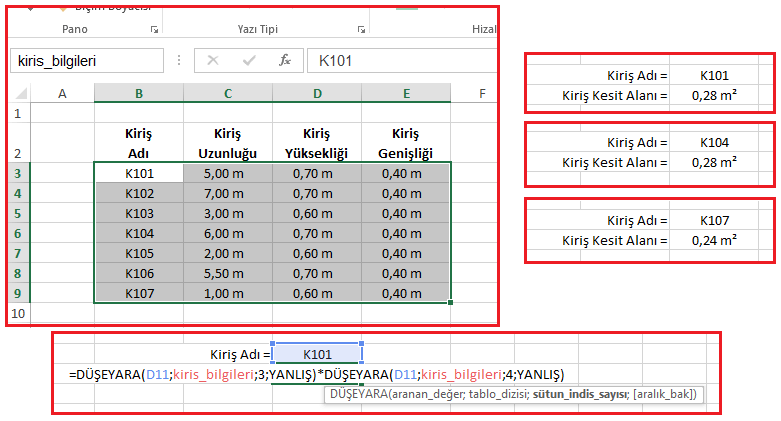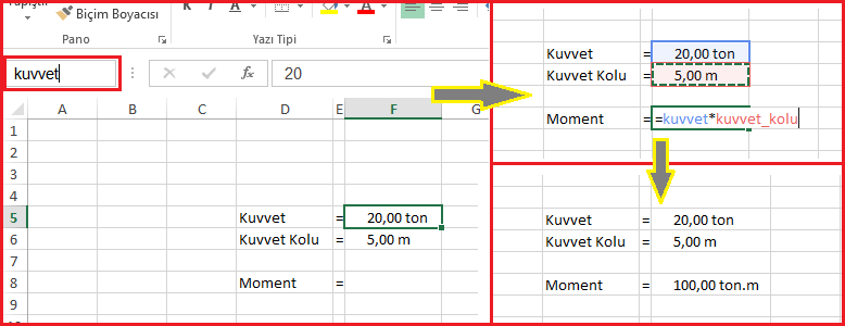 Mühendislikte Excel programının belki de en önemli özelliğinden biri olan “ad tanımlama” için isimlendirilecek hücreye tıklıyorsunuz. Daha sonra sağ üstte hücrenin kodunun yazıldığı ad kutusuna (örn: “B15”) hücreye vereceğiniz ismi yazıyorsunuz ve “Enter” tuşuna basıp adlandırmayı tamamlıyorsunuz. Bu işlemi tek hücreye yapabildiğiniz gibi çoklu seçim içinde yapabilirsiniz. Özellikle “DÜŞEYARA” gibi formüllerde kullanacağınız tablo isimleri için çok kullanışlı olacaktır.