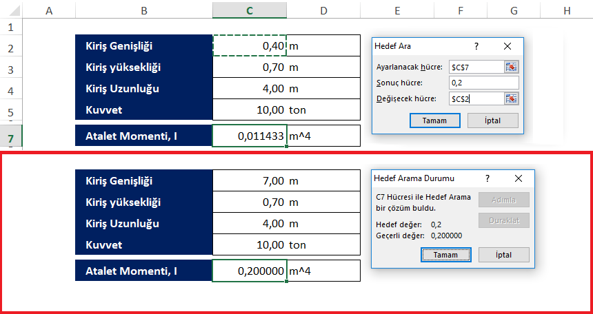 İlk önce, Hedef Arama aracını Veri > Durum Çözümlemesi > Hedef Arama yolu ile açıyoruz. “Ayarlanacak Hücre” kutusuna çözmek istediğiniz formül içeren hücreyi için başvurusunu, “Sonuç Hücre”ye hedef değeri girin ve “Değişecek Hücre”ye de ayarlamak istediğiniz değeri içeren hücre başvurusunu girin. Tamam’ı seçin ve Excel, hedefe ulaşmak için doğru girişi bulmak üzere yinelenir. Hedefe ulaştıktan sonra “Tamam” diyerek işlemi tamamlamış olursunuz.