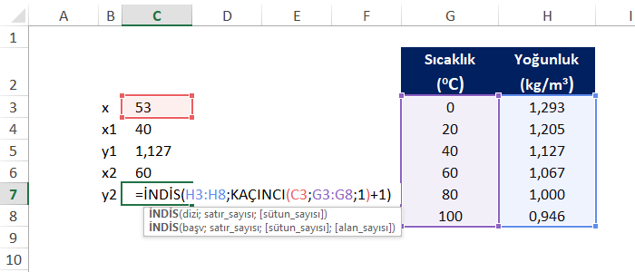 Ayrıca, bir veri kümesi üzerinde doğrusal enterpolasyon yapmak için İNDİS (INDEX) ve KAÇINCI (MATCH) kullanabilirsiniz. Bu, hedef x değerinden hemen önce ve sonra x ve y değerlerini bulmak için bu arama yönteminin esnekliğinden yararlanılarak yapılır.