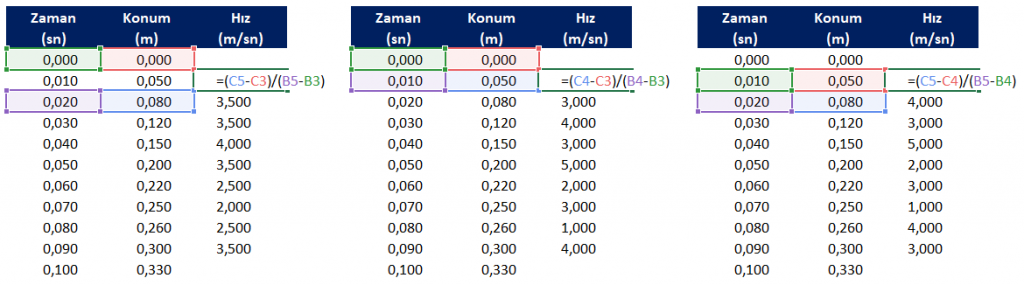 Türevleri hesaplamak için ileri, geri veya merkezi farkları kullanabilirsiniz. Bu yöntemlerin her biri, dy/dx’i hesaplamak için tablodaki verileri kullanır, tek fark, hesaplama için hangi veri noktalarının kullanıldığıdır.